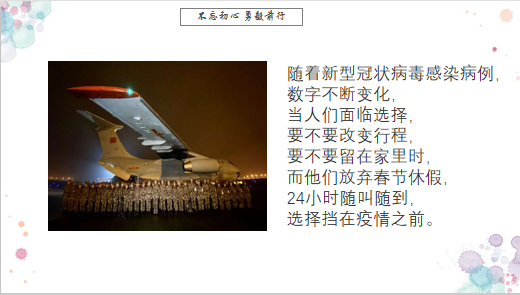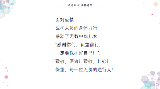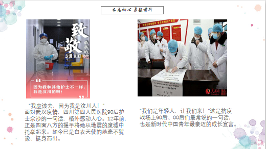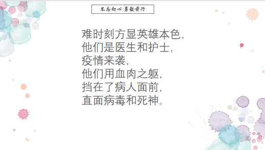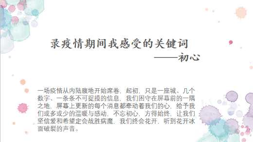 我选择“初心”这个关键词是为了宣讲那些在疫情工作中“不怕牺牲、救死扶伤、甘于奉献、”的逆行者们坚持初心,无私奉献的优秀事迹。让更多的人了解他们,铭记他们为国家做出的贡献,以此熏陶更多的人坚持初心,为爱奉献。