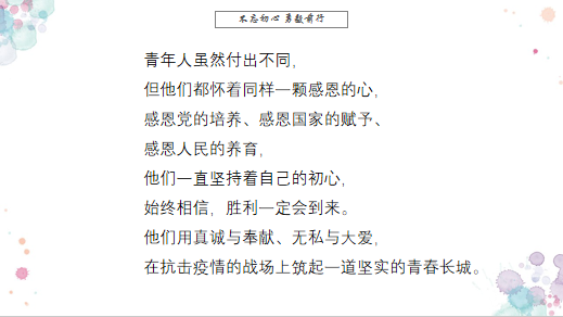 面对突如其来的疫情,无数青年一呼百应。在他们中间,有刚领结婚证就并肩战“疫”的新婚夫妻档,有把自己11万元嫁妆钱捐给抗疫一线的铁路女职工,有投身抗疫志愿服务第一线的理发师,有与母亲一起奋斗在武汉一线的大学生,有从国外背回1.5万只口罩支援抗疫的15岁学生,有将献血作为自己“表达心意”的社区志愿者……这些青年人虽然付出不同,但他们都怀着同样一颗感恩的心,感恩党的培养、感恩国家的赋予、感恩人民的养育,他们一直坚持着自己的初心,始终相信,胜利一定会到来。他们用真诚与奉献、无私与大爱,在抗击疫情的战场上筑起一道坚实的青春长城。