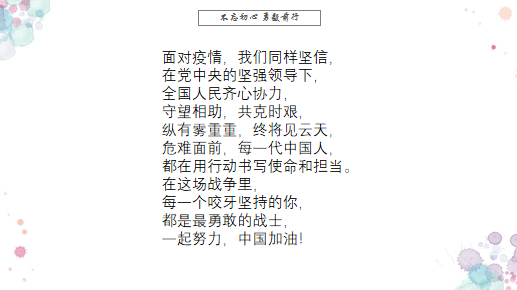 庚子鼠年如期而至,新春佳节的热闹却被新冠病毒悄悄藏起。一场疫情从内陆腹地开始席卷,起初,只是一座城、几个数字、一条条不可捉摸的信息,我们困守在屏幕前的一隅之地,屏幕上更新的每个消息都牵动着我们的心,给予我们或多或少的温暖与感动,不忘初心,方得始终,让我们坚信爱和希望定会战胜病魔,我们终会花开,听到花开冰面破裂的声音。