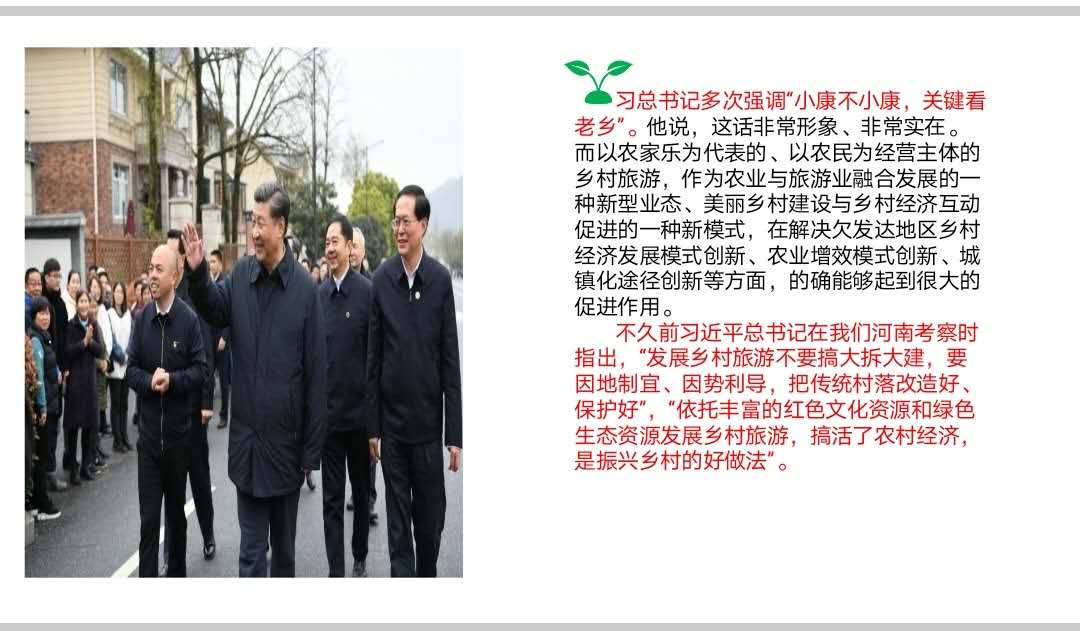 不久前习近平总书记在我们河南信阳考察时指出,“发展乡村旅游不要搞大拆大建,要因地制宜、因势利导,把传统村落改造好、保护好”,“依托丰富的红色文化资源和绿色生态资源发展乡村旅游,搞活了农村经济,是振兴乡村的好做法”。