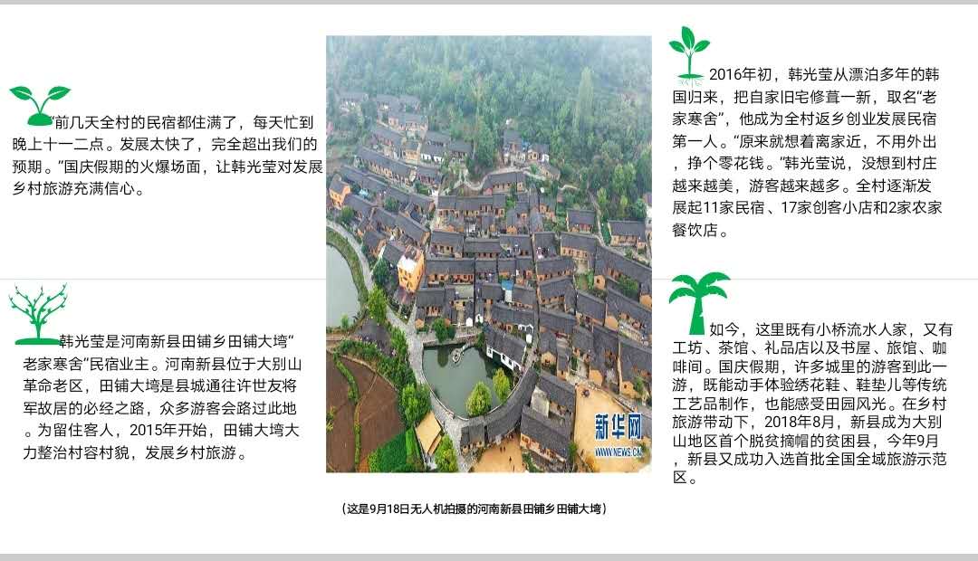 “前几天全村的民宿都住满了,每天忙到晚上十一二点。发展太快了,完全超出我们的预期。”国庆假期的火爆场面,让韩光莹对发展乡村旅游充满信心。韩光莹是河南新县田铺乡田铺大塆“老家寒舍”民宿业主。河南新县位于大别山革命老区,田铺大塆是县城通往许世友将军故居的必经之路,众多游客会路过此地。为留住客人,2015年开始,田铺大塆大力整治村容村貌,发展乡村旅游。2016年初,韩光莹从漂泊多年的韩国归来,把自家旧宅修葺一新,取名“老家寒舍”,他成为全村返乡创业发展民宿第一人。“原来就想着离家近,不用外出,挣个零花钱。”韩光莹说,没想到村庄越来越美,游客越来越多。全村逐渐发展起11家民宿、17家创客小店和2家农家餐饮店。如今,这里既有小桥流水人家,又有工坊、茶馆、礼品店以及书屋、旅馆、咖啡间。国庆假期,许多城里的游客到此一游,既能动手体验绣花鞋、鞋垫儿等传统工艺品制作,也能感受田园风光。在乡村旅游带动下,2018年8月,新县成为大别山地区首个脱贫摘帽的贫困县,今年9月,新县又成功入选首批全国全域旅游示范区。