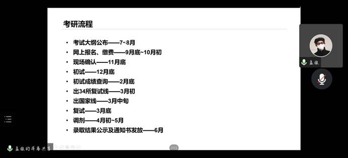 会议伊始,由影像学院20级辅导员李玉姣老师作开场介绍。接着,卫静学姐从个人考研情况、复试经验、初试经验三个方面展开介绍,强调复试时的面试应如何准备;席德扬学长重点从调剂前的准备、调剂中的准备和调剂后的准备三个方面为我们系统说明考研遇调剂的解决办法;然后,郭银吉学长详细分享了复试相关的具体问题以及自我介绍的注意事项;最后,由孟傲学长讲述了考研流程、各学科的推荐资料、时间规划以及复试需要准备的资料等几个方面使我们对考研有了更清晰的了解,更以“沧海行舟终得岸,蟾宫折桂在丁酉。”作为寄语,表达对即将的参加复试的同学的期许。至此,医学影像学院考研复试经验辅导会圆满结束。