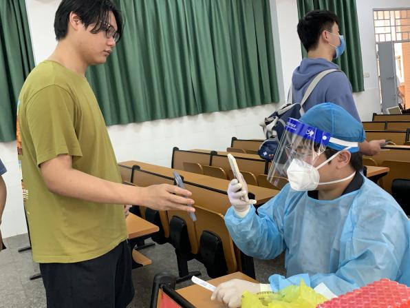 我支部党员积极参与疫情防控工作,与青协志愿者共同开展校内核酸检测,采集登记信息,保障校内学生高效有序地进行核酸检测采样,筑牢疫情防控坚固防线。