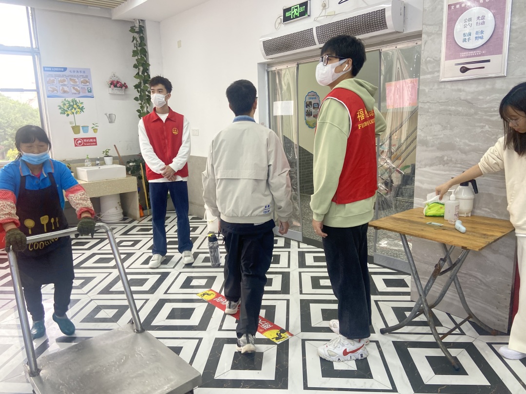 现正处于特殊时期,配合防疫教学任务由线下改为线上,同样食堂防疫也至关重要,我支部党员争做食堂防疫督导志愿者的工作,在中午和晚上的就餐时间,在食堂出入口现场监督与提醒就餐同学们自觉戴好口罩等。为保证食堂人群不聚集、不拥堵,在就餐高峰期到来之前,在岗引导人流,维持食堂就餐秩序。