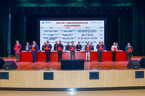丁中涛宣读《云南大学关于公布第19届教学成果奖评选结果的通知》,共有24项成果获奖。校党政领导为获奖者代表颁奖。