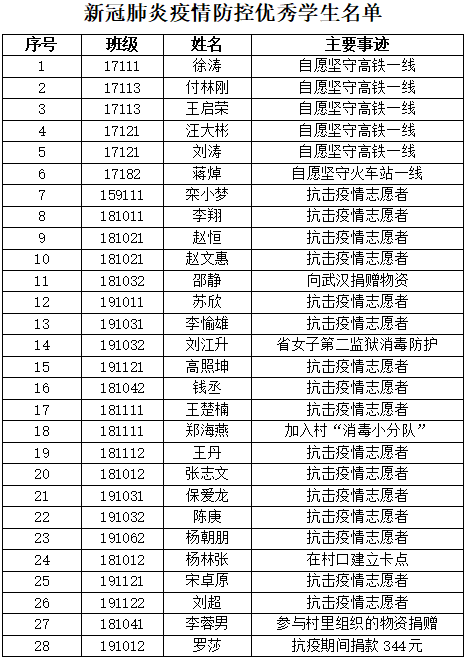 为了激励先进,鼓舞斗志,凝聚力量,坚定信心,学院对防疫期间做出突出贡献的108名优秀学生给予表彰,其中有28位优秀学生为支部教师直接或间接培养,名单如下表所示。