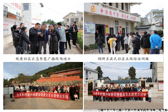 下午,全体党员前往石林县鹿阜街道大乐台旧社区和圭山镇矣美堵村进行实地调研。在大乐台旧社区实地查看了社区基层治理成果,“双提升”行动农林经济管理专业2022级本科学员、社区党总支书记李文龙介绍了党建引领城乡结合部基层治理的经验做法,以及通过“三有、三信、三做”打造“共建、共治、共享”互嵌式社区、探索数智化治理模式的实践路径。他表示,自己通过“双提升”行动的学习,将学思践悟运用到社区治理工作中,取得了一定的成效、得到了当地群众的认可。在矣美堵村,“双提升”行动行政管理专业2022级专科学员、雨美都乡村旅游开发有限公司总经理李丽萍介绍了当地借助“生态资源、民族文化、红色资源”三大优势整合农村特色资源要素、融合城市要素,以都市驱动推动乡村振兴的乡村旅游发展模式。通过实地调研和交流互动,学院领导和相关教师现场为学员解决学习过程中遇到的困难和问题,了解他们在基层治理和产业发展中遇到的问题和需求,并提出相应的建议。学院党总支书记、院长朱立韬同志指出,随着乡村振兴战略的深入实施,“双提升”行动肩负着培养乡村振兴人才、为乡村振兴提供智力支持和人才保障的重要使命,此次调研交流,目的是促进学院教师、教学点教师和学员的沟通交流,切实把教学相长、学学相长的成果转化为推动“双提升”行动教育教学质量提升的实际成效。他表示,见证了“双提升”行动学员的进步和成长,感到非常高兴和欣慰,学院将会加强对学员的持续跟踪培养,积极链接资源,围绕学员需求做好支持帮扶。