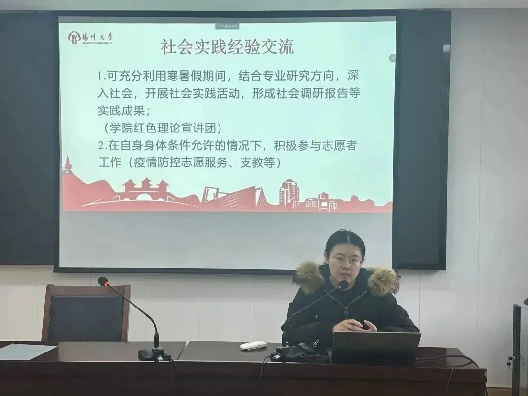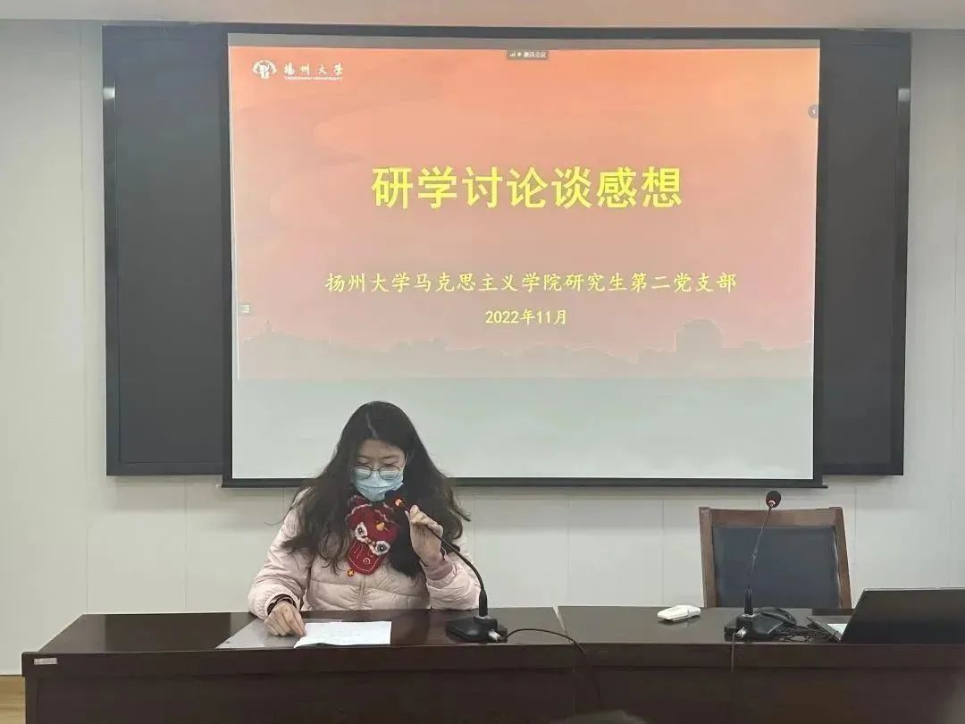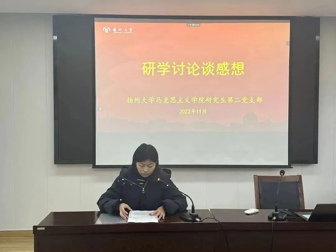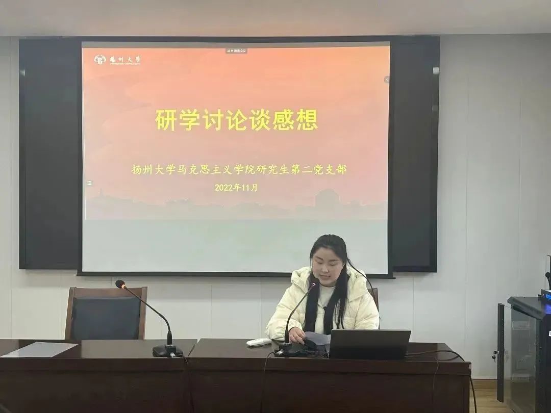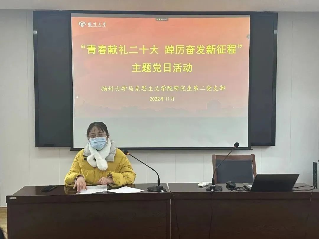为深入学习宣传贯彻党的二十大精神,充分发挥样板党支部的引领带动作用。11月30日下午,扬州大学马克思主义学院研究生第二党支部开展“青春献礼二十大 踔厉奋发新征程”主题党日活动。本次活动采取“1+2”模式,由支部党员带头宣讲微党课,支部优秀成员分享科研及实践经验。支部书记王艳红老师主持此次活动,支部研一、研二全体党员及入党积极分子到场参加。