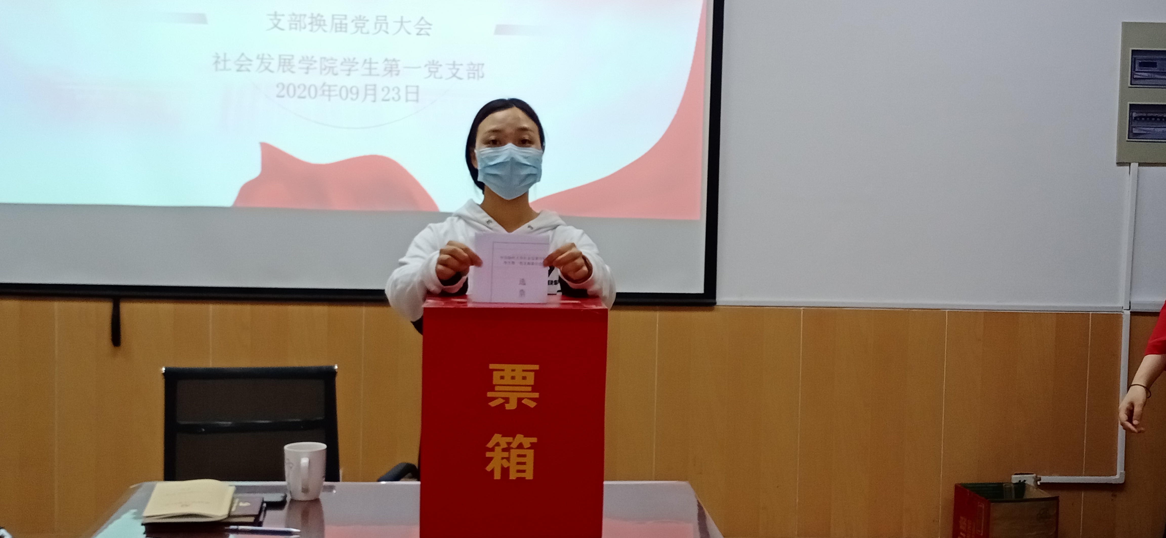 根据党章规定,监票人检査票箱后,计票人向有选举权的选举人分发选票。大会采取无记名投票和差额选举的办法,选举产生社会发展学院学生第一党支部委员3名,差额1名,由监票人按姓氏笔画为序向大会报告委员候选人的得票情况。每位选举人经过慎重考虑,写下了自己神圣的一票,并依次投入票箱。在监票人的监督下,两位计票人对选票进行清点。最终,肖薇、李欣怡、卞佳玉三位同志获得了支部党员同志的一致认可,当选为新一届支部委员会委员。