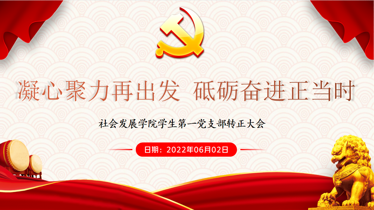 2021年12月,习近平总书记在党的十九届六中全会上的发言中指出,“坚持党的政治建设,始终保持党的团结统一”是“党的生命,也是我们党能成为百年大党、创造世纪伟业的关键所在”。为坚持党员发展的政治引领方向,加强党支部思想政治建设,2022年6月1日-2日,社会发展学院学生第一党支部先后召开发展了“勇立潮头踏新程,奋楫扬帆谱新篇”党员接收大会和“凝心聚力再出发,砥砺奋进正当时”预备党员转正大会。院党委副书记居再宏和学生第一党支部书记肖薇参加两次大会。