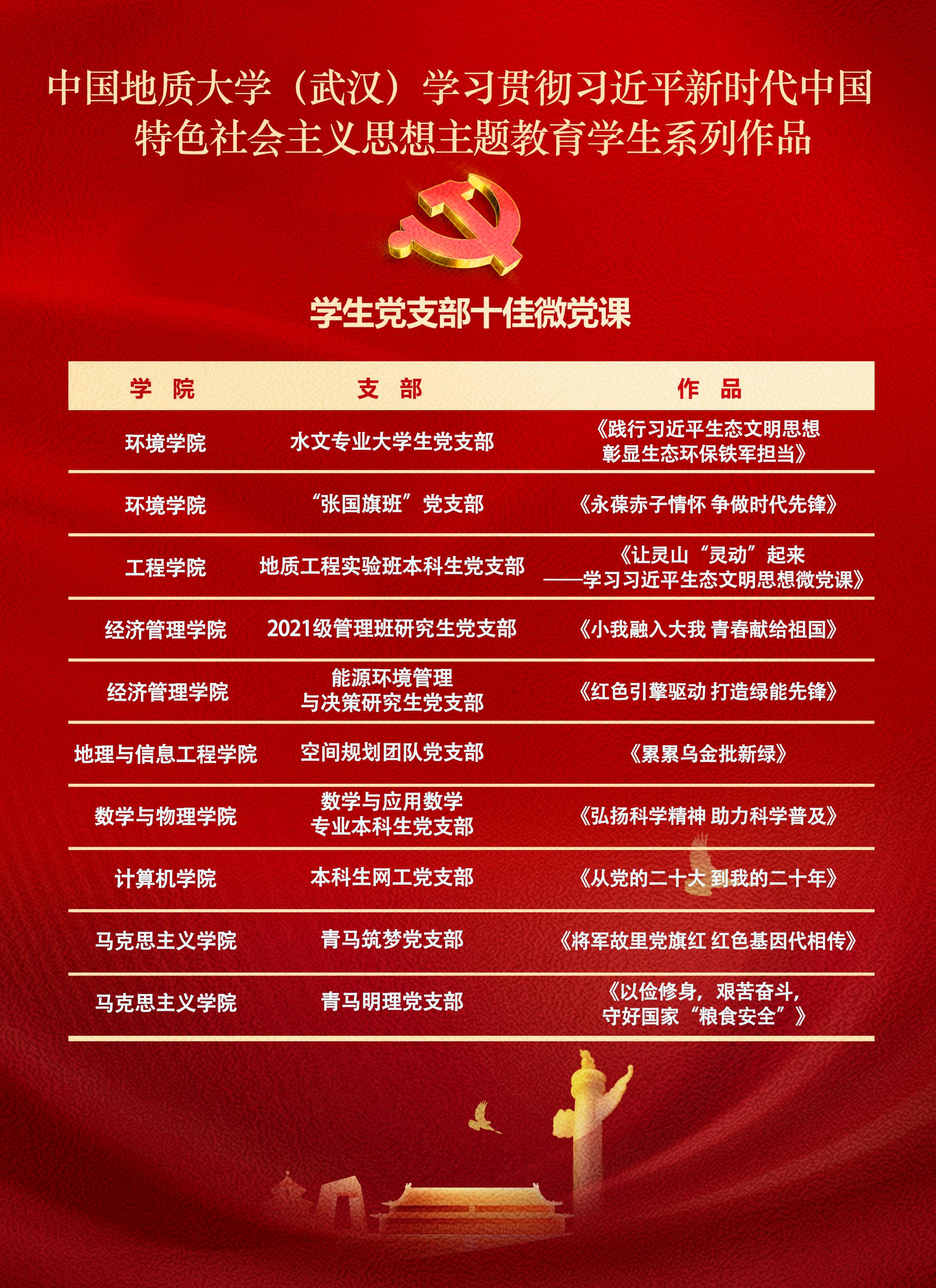 支部好微课要求学生党支部围绕学习贯彻习近平新时代中国特色社会主义思想主题教育,结合学院学科特色和支部工作特色选取小切口主题,精心录制主题微党课视频。数学与物理学院数学与应用数学专业本科生党支部《弘扬科学精神 助力科学普及》、工程学院地质工程实验班本科生党支部《让灵山“灵动”起来——学习习近平生态文明思想微党课》和环境学院水文专业大学生党支部《践行习近平生态文明思想 彰显生态环保铁军担当》等十部微党课入选。微党课中,学生党员骨干踊跃出镜,通过选取贴近青年学生的主题,以青年视角和话语体系宣讲习近平新时代中国特色社会主义思想,不断提升主题教育的影响力和实效性。