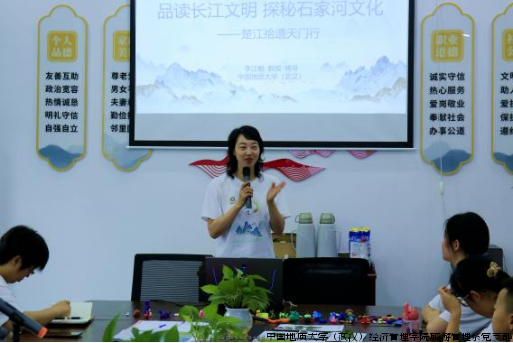 李江敏老师以“品读长江文明 探秘石家河文化”为核心主题,通过“我们的母亲河——长江”“我们的家乡——天门”“我们的文化——石家河”三部分进行宣讲,团队成员携手小朋友们进行了暑期课堂成果展示,满满的文化自豪感油然而生。中国地质大学(武汉)经济管理学院旅游管理系党支部与中共天门市竟陵街东方社区委员会结对共建,校地共同继续推进文化传承教育。