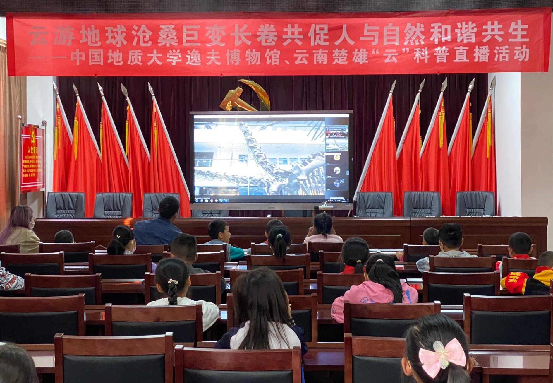 为助力乡村振兴、文明社区建设,落实国家“双减政策”,4月16日,由中国地质大学(武汉)、楚雄州共青团、楚雄市共青团联合主办,中国地质大学逸夫博物馆、中国地质大学(武汉)研究生支教团承办的“云游地球沧桑巨变长卷 共促人与自然和谐共生——中国地质大学逸夫博物馆、云南楚雄云科普直播活动”举行。