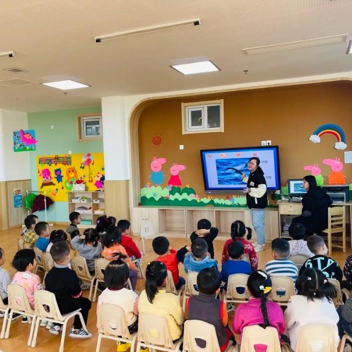 前往上马街道西部中心幼儿园的志愿者刘思影和张想以《海底小纵队》这部动画片为切入点,带领小朋友初步认识了海洋生物,并依次介绍了小飞鱼、白鲸与水母相关知识。志愿者富有感染力的讲解,吸引了小朋友们的注意。他们全神贯注地听讲,争先恐后地参与课堂问答。