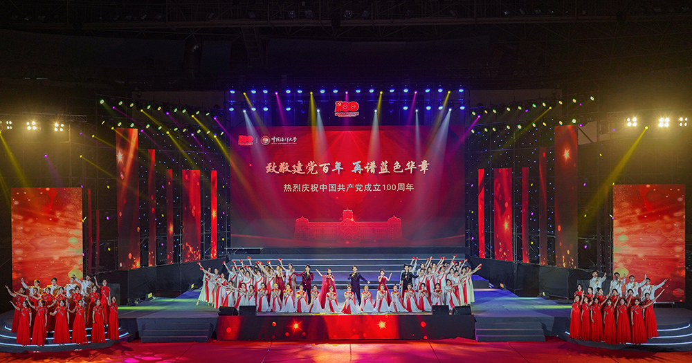 2021年6月17日晚,浩瀚星空下,中国海洋大学体育馆灯火璀璨、流光溢彩,处处洋溢着喜庆祥和的节日气氛,一场以“传承红色基因 铸就蓝色梦想”为主题的庆祝建党100周年文艺晚会在此隆重上演。