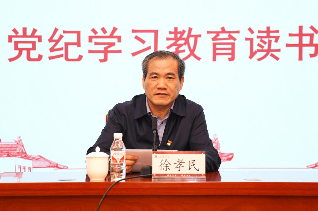 徐孝民指出,这次党纪学习教育,就是要从学纪入手,推动各级党组织和领导班子从严抓好党的纪律建设,推动广大党员、干部强化遵守纪律的自觉,知行知止、令行禁止,以严明的纪律确保全党自觉同以习近平同志为核心的党中央保持高度一致,形成推进中国式现代化的强大动力和合力。党纪学习教育的对象是全体党员,领导干部作为“关键少数”,要发挥“关键作用”,严守学习纪律,保持良好学风,在学纪、知纪、明纪、守纪上树立更高标准、落实更严要求。要把“学纪”作为锤炼党性的关键举措,筑牢思想之基;要把“知纪”作为校正偏差的标尺准绳,常怀敬畏之心;要把“明纪”作为自省自律的长鸣警钟,保持正派作风;要把“守纪”作为干事创业的重要底线,坚守清正廉洁。