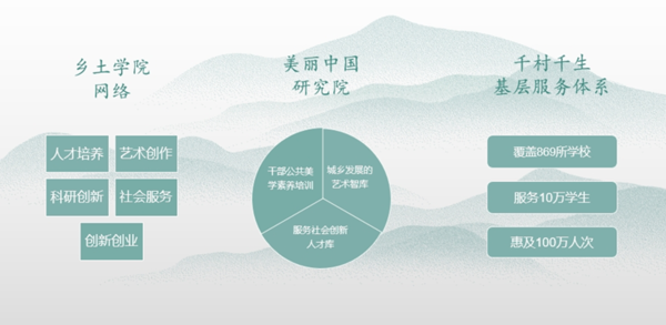 提出“以乡土为学院”的艺术实践教学体系,构建起遍布28个省区城乡的全国性乡土学院网络。“以乡土为学院——创新艺术人才培养”项目荣获教育部教学成果一等奖。成立美丽中国研究院,开展“艺术乡建”理论研究,建立案例库,举办“美丽中国100案”巡展,共享理论研究成果和艺术乡建路径。持续20年打造学生实践品牌“千村千生”,在浙江20余个乡村建立“千村千生”基层服务基地,子品牌“乡村艺课”覆盖全国800余个乡村学校,线下线上教学惠及100多万人,获评全国“四个100”最佳志愿服务项目。