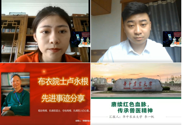 来自华南农业大学、华中农业大学、南京农业大学、西北农林科技大学四所高校的党员学生代表向参加活动的师生分享了红色故事。华南农业大学的黄颖然分享的布衣院士卢永根的先进事迹,点燃了同学们心中的爱国主义火焰;华中农业大学的李一帆分享的学校师生在抗击新冠疫情中的无私奉献,展现了兽医人在新时代的责任与担当;南京农业大学的李姿萱分享的红医精神和红医故事,表达了兽医学子励志为畜牧兽医行业和公共卫生事业发展贡献力量的决心;西北农林科技大学的刘文轩分享的王建辰教授的故事,为兽医学子们树立了锤炼本领、承担责任的楷模。