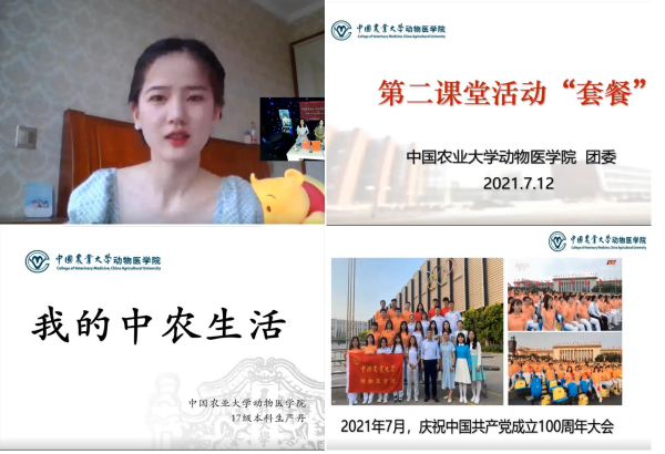 中国农业大学动物医学院学生严丹分享了自己的中农生活,介绍了中农动医的学术活动和党团班的丰富活动;学院团委书记潘伯阳以《第二课堂活动‘套餐’》为题介绍了学院团委丰富的学生活动,展示了中农动医师生在新中国成立70周年活动、冬奥会志愿者储备人才选拔、庆祝中国共产党成立一百周年大会等重大活动中的身影,参与的学员们也表达了对中农生活的向往。