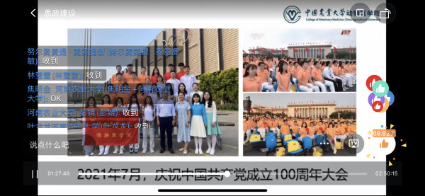 动物医学院党委书记高铭宇以《百年风华 再启新程——中国农业大学的红色印记》为题主讲云端微党课。她领学习近平总书记在庆祝中国共产党成立100周年大会上的重要讲话精神,并激励同学们在新征程上更加坚定、自觉地牢记初心使命,开创美好未来;结合学校116周年的建校史和97年党的组织发展史,向学员们讲述了中国农业大学的悠久红色历史和光荣的革命传统,勉励学员们学习并发扬追求进步的革命精神、自力更生的奋斗精神、科学报国的为民精神、强农兴农的担当精神;最后,以习近平总书记对青年殷切期望号召当代兽医青年要以实现中华民族伟大复兴为己任,胸怀强农兴农、知农爱农的重任担当,把青春奋斗融入党和人民事业,以实际行动践行“请党放心 强国有我”的青春誓言。