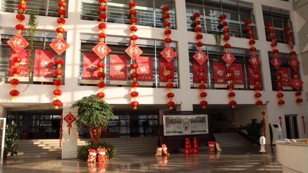 关怀慰问师生之余,为营造更为浓郁的新年氛围,学院对楼宇建筑进行特别布置,门口火红的灯笼和贴满福字格外亮眼,走进大厅,高高垂落的灯笼吊饰串着“祝全体师生新年快乐”的祝福大字抢先映入眼帘,让掩映其间的11幅牛年肖像图更显活泼生动,可爱俏皮的玩偶摆放各处,三三两两,让牛年的氛围更加亲切直观。
