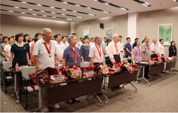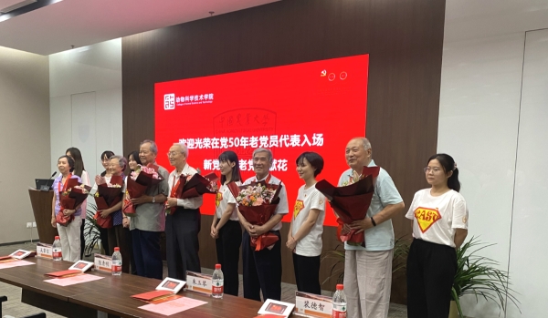 会场上洋溢着庄严热烈的音乐,老党员们佩戴着闪闪发光的“光荣在党50年”勋章,迈着矫健的步伐步入会场,新党员们簇拥着鲜花,为到场的吴常信、陈清明、朱玉琴、史德宽、张劳、裴德智等6位光荣在党50年老党员代表献花。全场师生共同起立向老党员们致以崇高的敬意,大会在国歌声中正式开始。