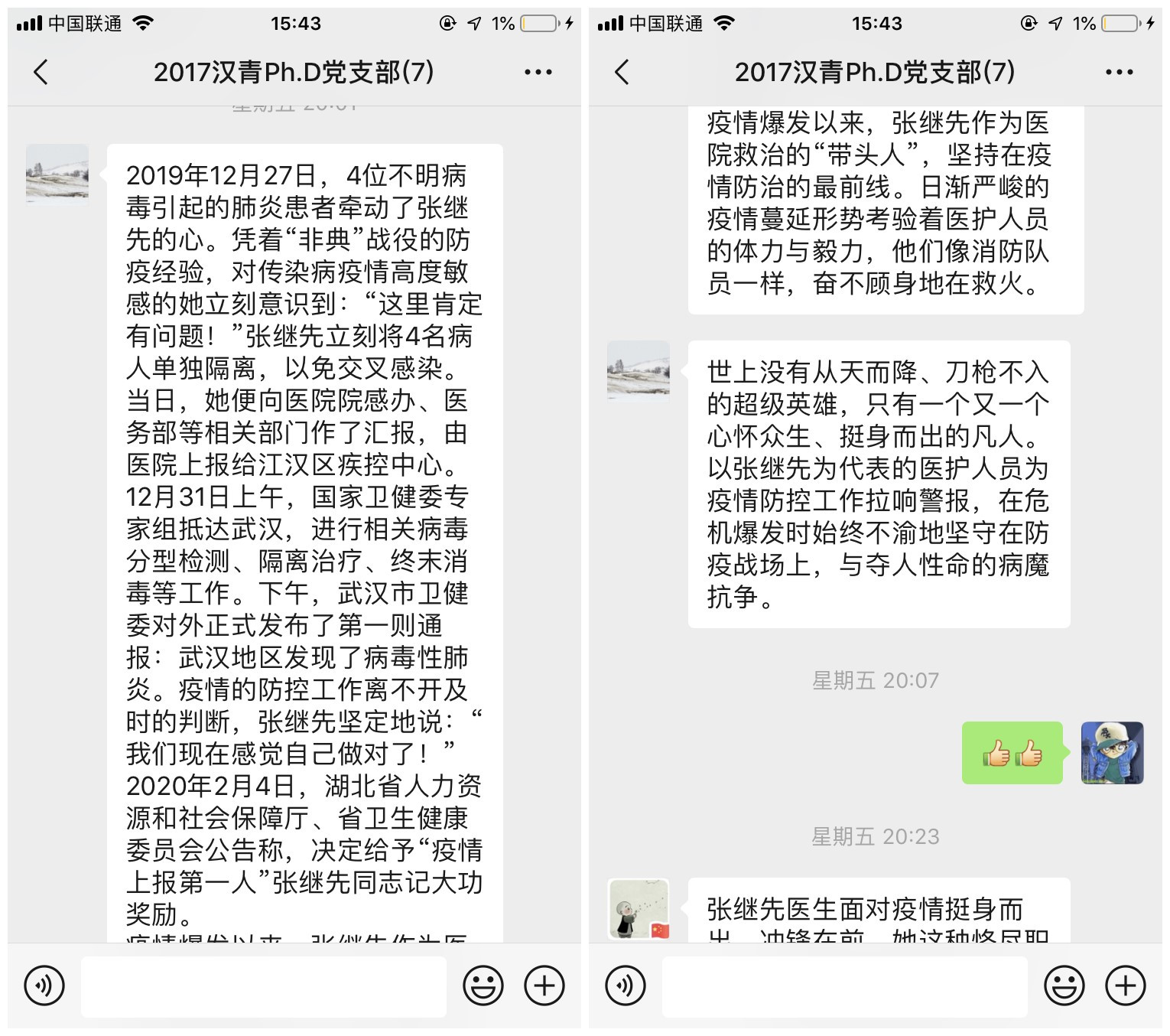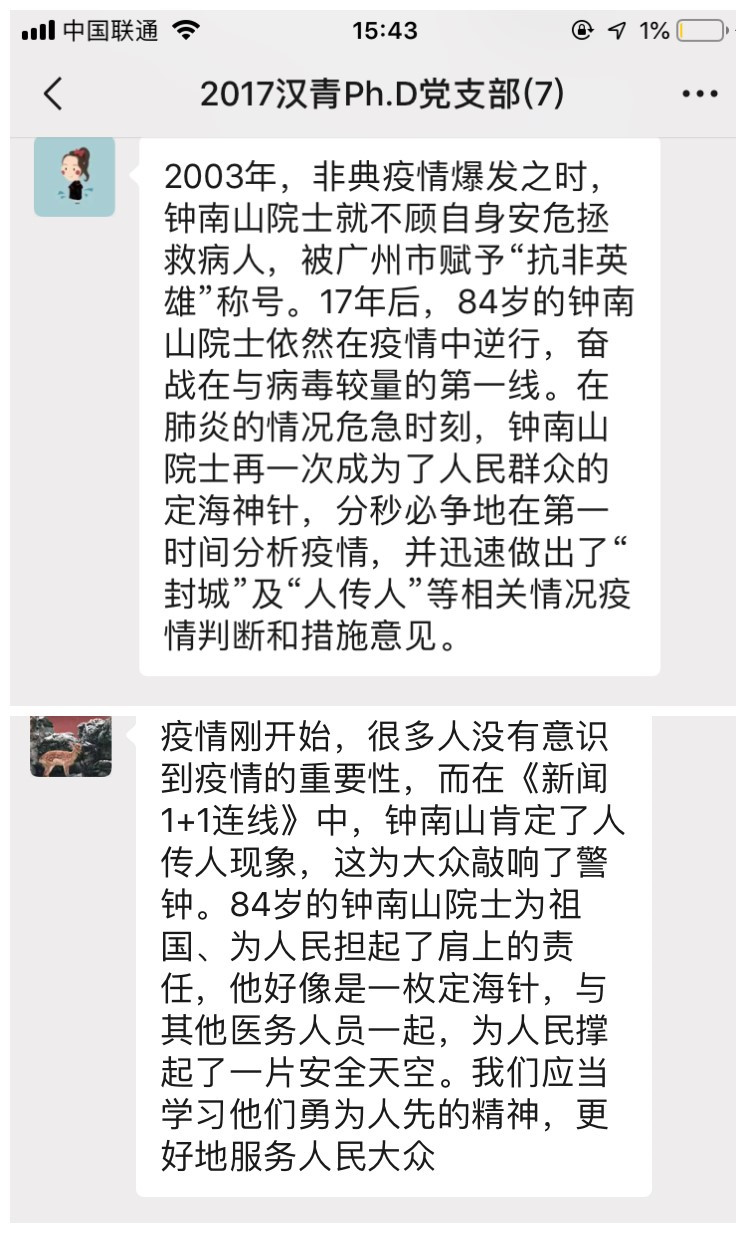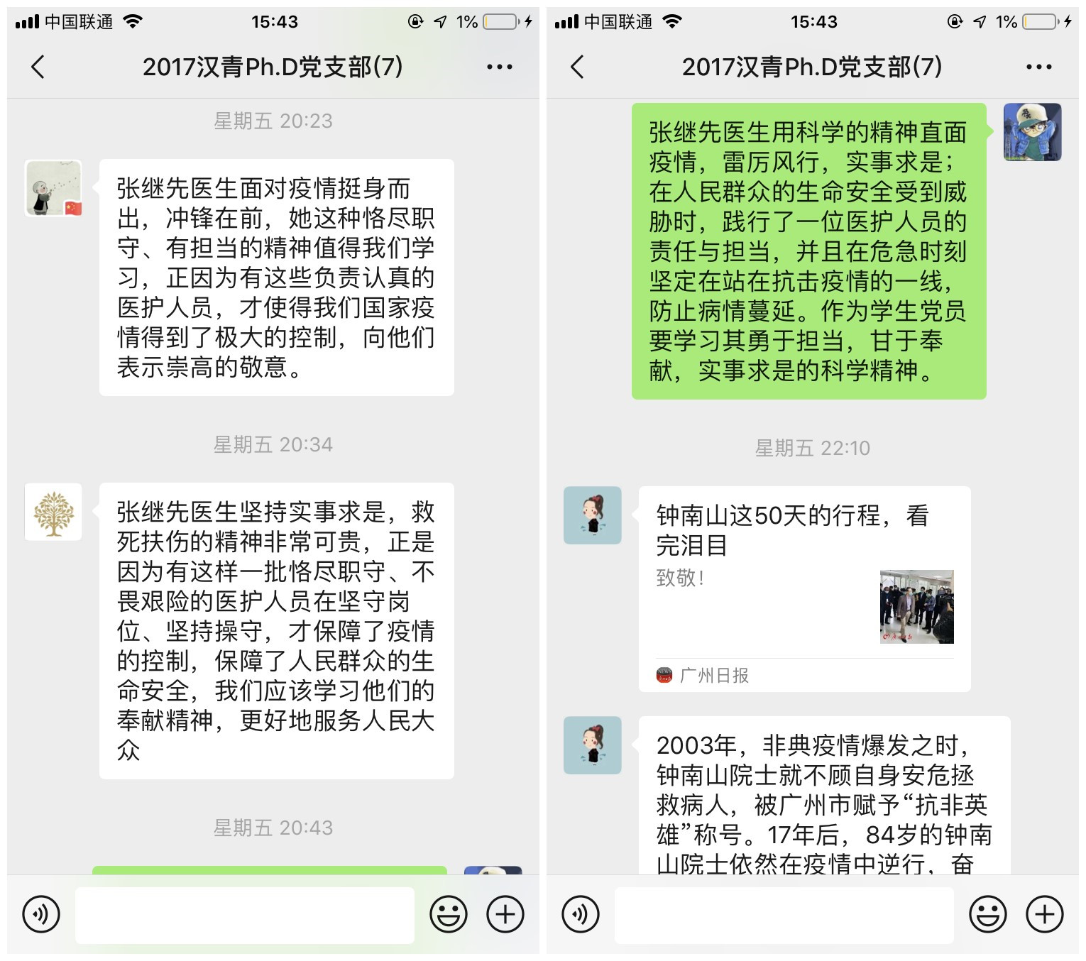2020年3月13日,2017级汉青学硕党支部召开线上党支部会议,以画好共同抗击疫情的同心圆为主题,各位党员同志各抒己见,讨论疫情中涌现出来的英雄事迹,供大家一同讨论和学习。