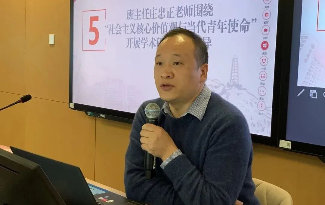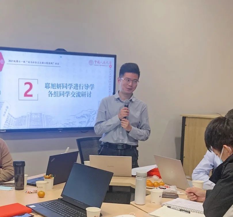 为深入学习贯彻党的十九届六中全会精神,深刻领悟《中共中央关于党的百年奋斗重大成就和历史经验的决议》丰富内涵和重要意义,深化理解和积极践行社会主义核心价值观,2021年12月13日下午,中国人民大学马克思主义学院2021级博士一班联合马克思主义学院博士生宣讲团、青年马克思主义研究会于立德楼710研讨室共同举行“全球语境中的社会主义核心价值观”文本研习会、学术研讨会、宣讲交流会。马克思主义学院副教授、2021级博士一班班主任庄忠正出席会议。会议由班长周鼎主持。