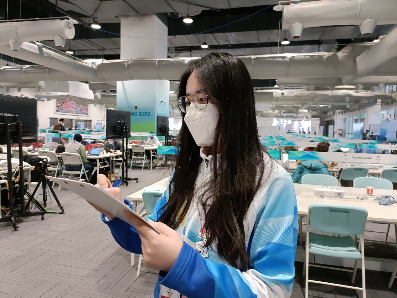 “这里是ZPC新闻发布厅预定服务台,请问有什么可以帮您”“这里是ZPC主新闻发布厅,现在进行1号鹅颈麦测试…”我的工作围绕场馆内三个新闻发布厅展开:协助代表团预定、召开新闻发布会,管理新闻发布厅等。作为一名媒体志愿者,我十分有幸于京北雪原上迎接盛会,在“云顶”场馆群中接待四方媒体,协助他们讲述卓越背后的逐梦故事,记录嘉宾们的欣喜时刻,传递激昂的冬奥声音!