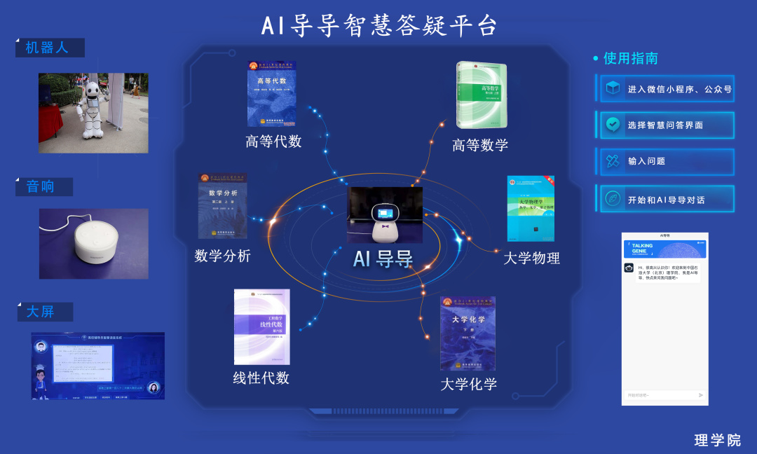 综合应用人工智能、云计算、自然语言处理技术和大数据技术,自主开发适应大学生学业发展需求的综合化辅导智慧系统—,现启发式仿真人对话式辅导,构建一个“无时不在、无处不在”的泛在化学习环境,给全校2万余名学生每人配备专属“智能学伴”,实现两个课堂同频共振,为学生健康成长发展提供及时有效的指导与服务。