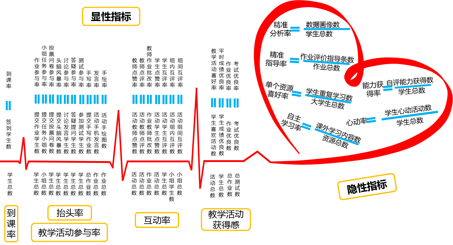 显性指标主要包括到课率、抬头率、单个教学内容学习率、互动率、教学效果获得感等具体指标。其中,抬头率用作业参与率、小组任务参与率、投票问卷参与率、头脑风暴参与率、讨论参与率、答疑参与率、测试参与率、手写率、发言率、手绘率等指标综合衡量;单个教学内容学习率可拆分成微视频、音频、图片、文档、链接资源等内容的学习情况;互动率包括教师点赞率、教师点评率、教师作业批改率、学生点赞率、学生互评率、组内互评率、组间互评率等; 教学效果获得感由教学活动喜好率、平时成绩优良率、作业优良率、随堂测试优良率、期中考试优良率、期末考试优良率等指标体现。