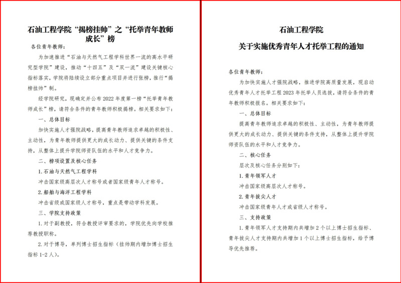 “十四五”以来,学院持续完善职称评审制度,破“五唯”,立“新标”,让潜心育人、真做学问、做真学问的教师拥有更多晋升机会,激励更多青年教师勇挑重担,多做实质贡献;面向新阶段高质量发展要求,修订完善《奖励性绩效工资发放办法》,坚持“基数+贡献”导向,坚持“高大新”发展方向,坚持分层分类原则,创新团队考核模式,充分调动青年教师的积极性、主动性,着力提升人才活力竞争力;出台《石油工程学院研究生导师岗位管理办法》,完善导师日常评价机制,将立德树人、教书育人作为评价的首要标准,强化导师在育人方面的主体作用;强化人才工作经费保障,设立人才工作专项经费和“引才贡献奖”,奖励在人才队伍建设工作中表现突出的单位和个人;今年,学院出台《石油工程学院加快实施人才强院战略,推进学院高质量发展三年行动方案(2023-2025)》,一系列人才制度建设为学院的可持续、高质量发展提供了坚强的制度保障。