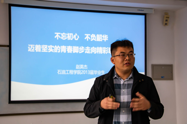 为了让石工学子明确大学期间要培养的能力素质,提高未来综合竞争力,11月28日,由学院团委主办、学生会承办的第五期“油模油Young”青年对话活动在特种实验楼A502教室举办,本期对话邀请2013届杰出校友赵英杰作主题为“不忘初心、不负韶华,迈着坚实的青春脚步走向精彩职业生涯”的分享,学院党委副书记赵晓珂、学院团委书记单珣出席,本研石1902班陈晓萱主持活动,学院各年级学生代表参加。