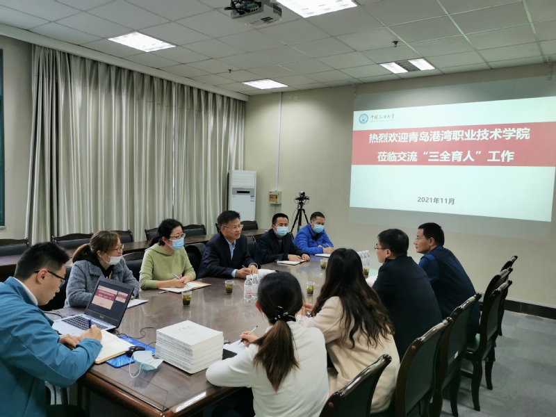 11月15日,青岛港湾职业技术学院副院长陈纪伟一行7人来院交流“三全育人”综合改革试点建设工作,石油工程学院副院长王建升、党委副书记陈银吨、团委书记单珣及辅导员王静参加交流。