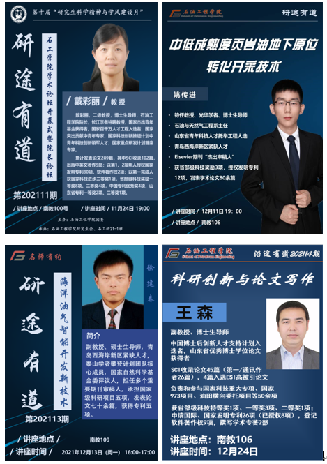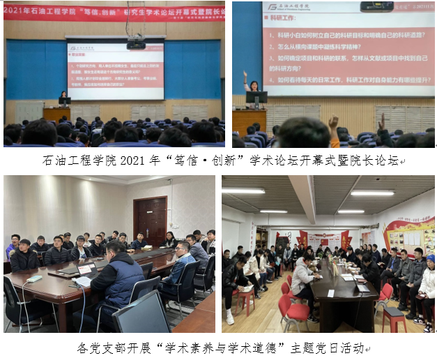 在本届研究生科学精神与学风建设月中,石油工程学院以促进学生的学术成长为中心,依托学院“笃信、创新”学术论坛和SPE学术平台,提高学生的科研能力、团队能力和表达能力,从而实现学生的素质综合化、能力全面化、专业特色化、学术国际化。举办了诲人传道——学者讲坛、群英荟萃——系列学术交流会、百舸争流——系列学术竞赛、修身正己——学风建设等四类品牌系列活动。共举办30余场相关活动,吸引近1500人次研究生参与,实现班团、党支部、课题组等各类研究生群体全覆盖,有效提升了学风育人效能,引导研究生弘扬求真务实、勇于创新的科学精神,营造风清气正、诚信严谨的学术氛围,培养研究生惟真惟实的学术品格,助力探索建立学院研究生学风建设长效机制。