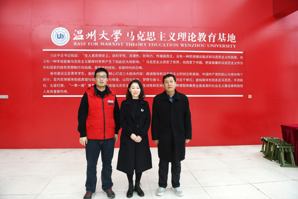 授牌仪式结束后,与会人员参观温州大学马克思主义理论教育基地,该基地给各位参会人员留下了深刻的印象。基地场馆中陈列了国家图书馆1:1复制的马克思、恩格斯的雕像,它无声的召唤着来基地参观的人们走进马克思,读懂马克思,长忆马克思。场馆中的图片和文字既展现了一部马克思主义的波澜壮阔的发展史,又呈现给参观者马克思主义若干小阶段详尽的历史,基地配有很多珍惜资料。如《共产党宣言》手稿的第一页,头两行为马克思夫人燕妮的手迹,将燕妮帮助马克思誊写手稿等的友情、爱情跃然纸上。