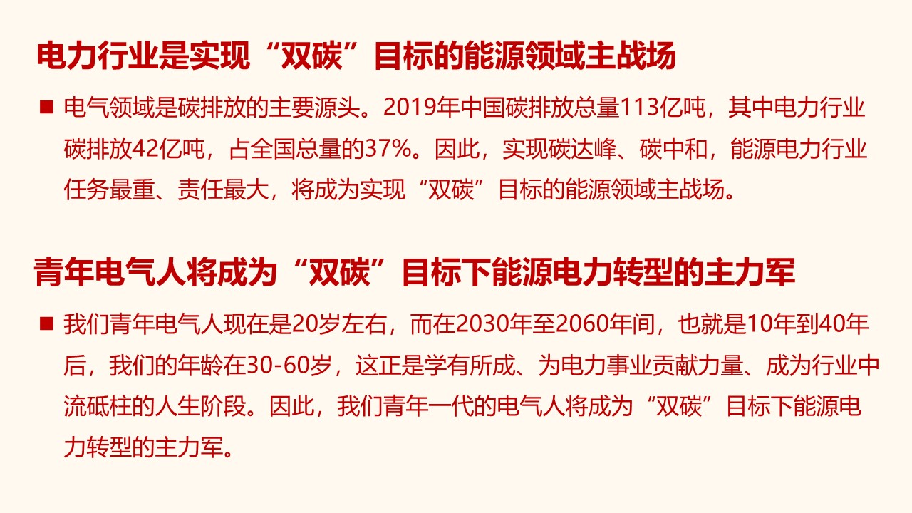 而再来看看我们电气青年人,我们青年电气人也将成为“双碳”目标下能源电力转型的主力军。我们青年电气人现在是20岁左右,而在2030年至2060年间,也就是10年到40年后,我们的年龄在30-60岁,这正是学有所成、为电力事业贡献力量、成为行业中流砥柱的人生阶段。因此,我们青年一代的电气人将成为“双碳”目标下能源电力转型的主力军。