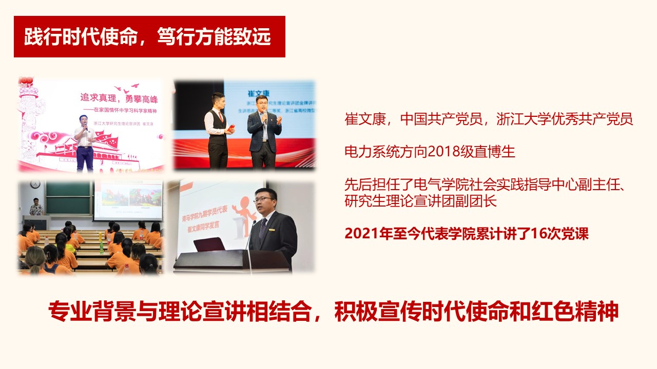 比如,也可以像我们支部的崔文康同志这样,把我们的专业背景与理论宣讲相结合,积极主动地讲授党课,宣传时代使命和红色精神,2021年至今他代表学院累计讲了16次党课,让更多人听到了新时代电气人的声音。