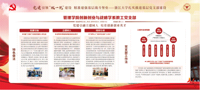 近日,“浙江大学基层党支部建设成果展” 在浙江大学紫金港校区文化广场展出。管理学院创新创业与战略学系教工党支部《党建引融立德树人 培育创新创业英才》光荣入选样板党支部风采展示。