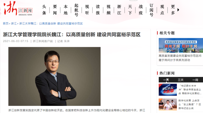 作为长期为政府献言献策、贡献管理智慧的智库,魏江教授将学习贯彻习近平新时代中国特色社会主义思想与浙江创新创业探索与实践相结合,撰写了题为“以高质量创新建设共同富裕示范区”的文章,为浙江实践行“八八战略”,打造“重要窗口”,争创社会主义现代化先行省、建设高质量发展共同富裕示范区建言献策,浙江新闻客户端作了刊载。