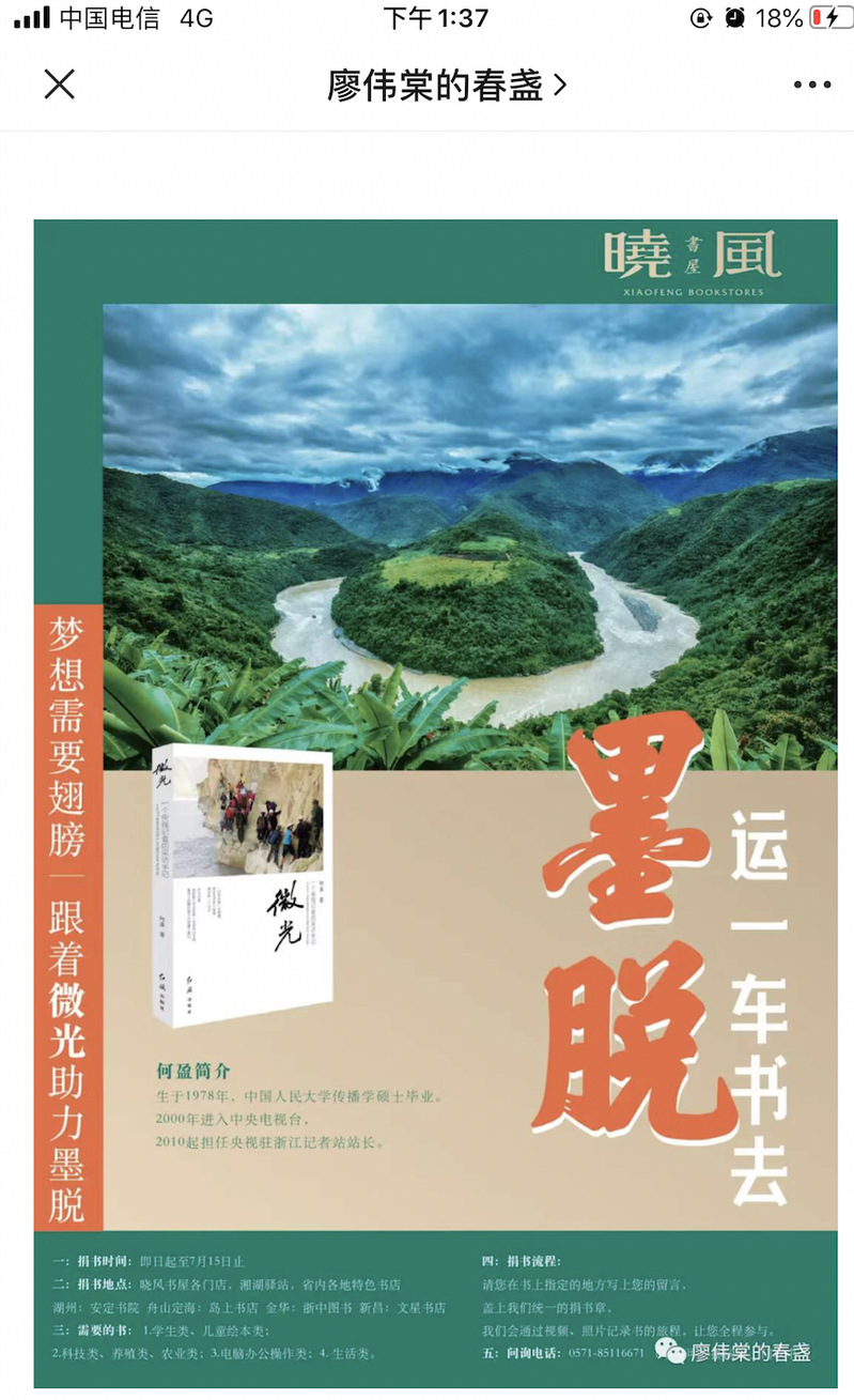 本次赠书活动由央视浙江记者站站长的总台央视记者何盈联合杭州晓风书店的掌柜共同发起,发起人之一何盈曾三次进入墨脱。前不久当她得知当地图书馆很少有孩子想看的书之后,她便萌生了“运一车书去墨脱”的念头,恰好晓风书屋创始人朱钰芳是何盈的书迷,她通过何盈的新书《微光》,了解到墨脱背后的故事。因此两位一同发起了“梦想需要翅膀,跟着微光助力墨脱”捐书活动,希望能够动员身边的资源,为墨脱的孩子们送去温暖与力量。