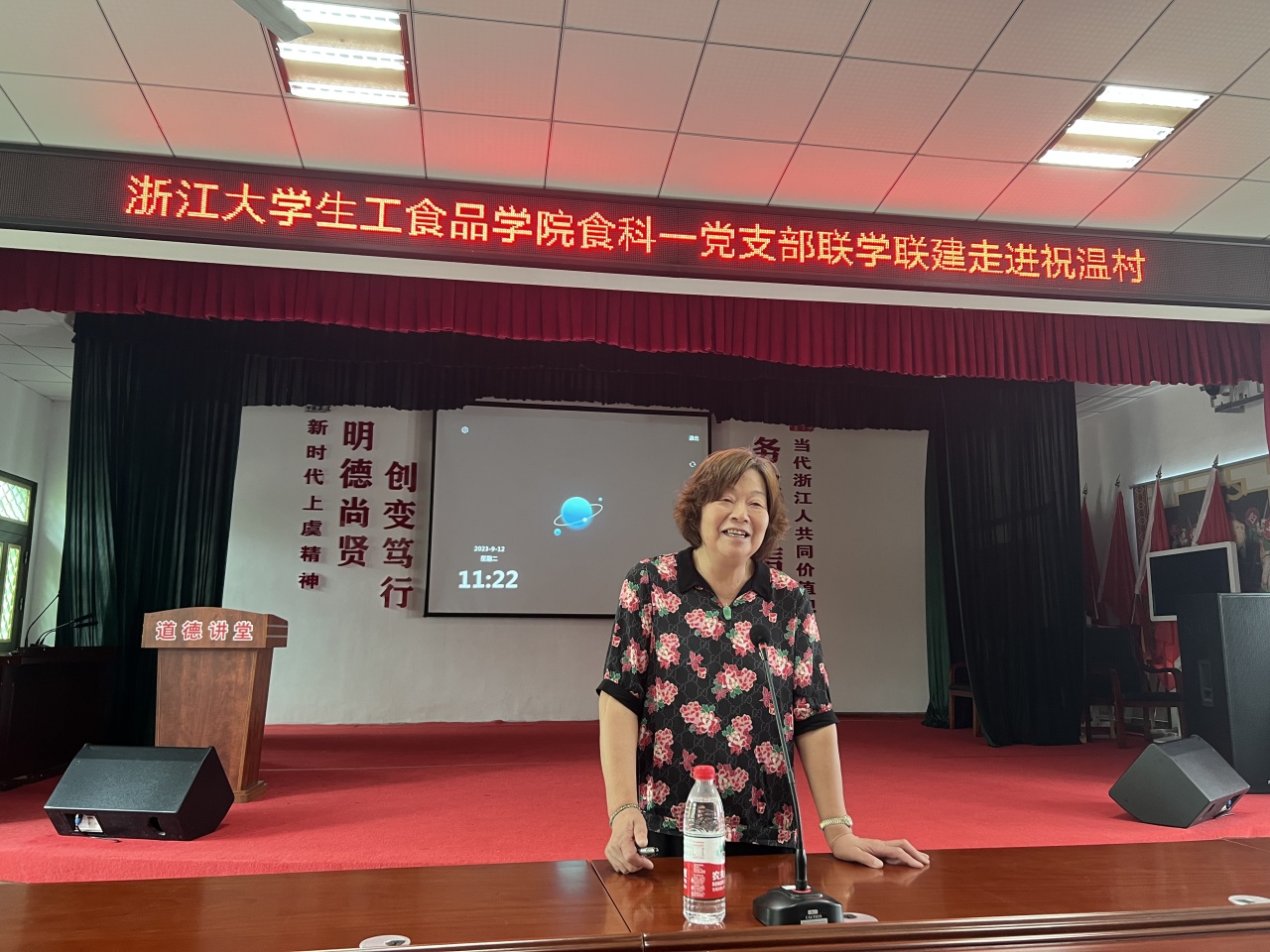 活动当日,浙江大学生工食品学院师生在杭兰英老书记和祝温村负责人的陪同下前往祝温村党建馆、农文旅体验中心进行学习,实地考察村容村貌,了解了祝温村是如何从交通闭塞、发展缓慢的小山村发展为如今生活宽裕、乡风文明、村容整洁的样板村。