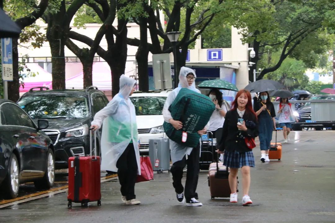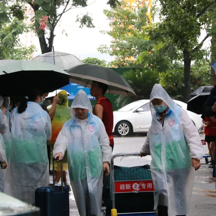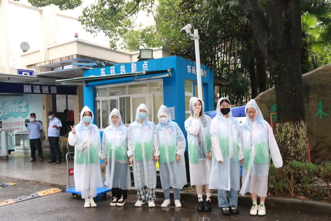 受台风“灿都”影响,宁波地区天气较差,新生报到期间阴雨连绵。9月14日,e党支部党员志愿服务站的学生党员和入党积极分子志愿者身穿志愿者服,外套雨衣,在学府东苑门口等候新生的到来,并以热情友善的态度和饱满的精神对待每一位新生,指引他们根据常态化疫情防控要求,完成体温检测、扫码登记、出示防疫行程卡与甬行码,省外人员则还需出示核酸报告。