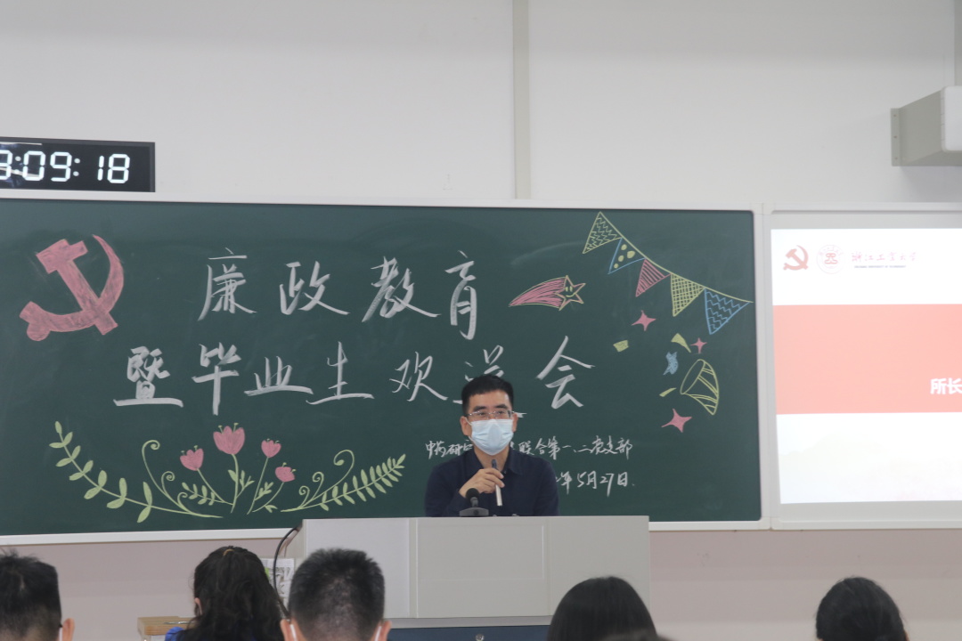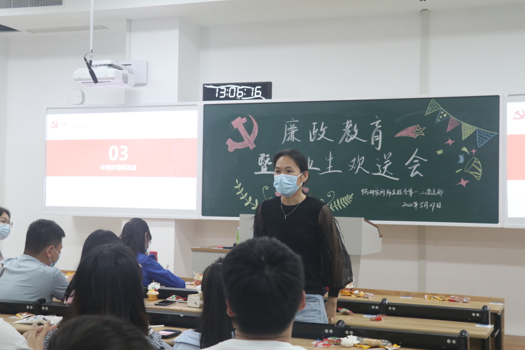 为深入学习习近平新时代中国特色社会主义思想和党的十九大精神,贯彻落实全国 工作会议精神,引导毕业生党员廉洁修身、牢固树立廉荣贪耻的人生理念,正值毕业生党员离校之际,中药研究所师生联合第一、二党支部于2022年5月27日在药学院1号楼B110公共教室召开中药所研究生培养课程思政系列——2022届研究生毕业生党员廉政专题教育暨中药研究所毕业研究生欢送会。