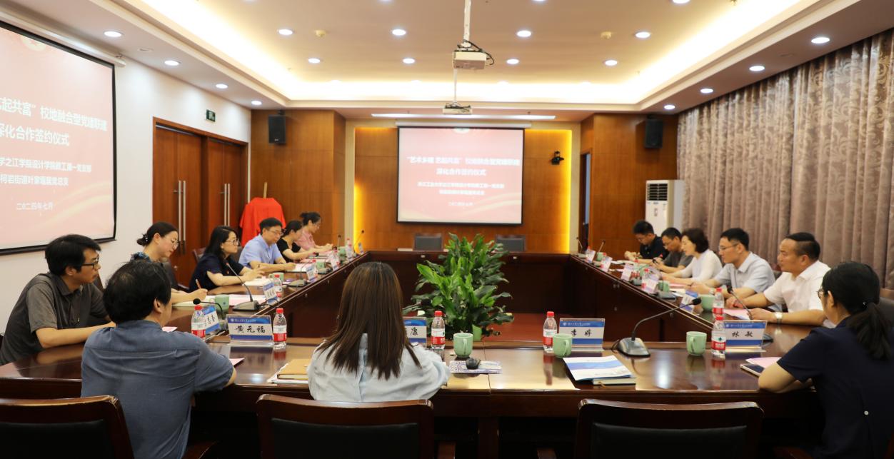7月25日上午,设计学院党总支与柯岩街道党工委“百个艺术院系支部联村共建”校地融合型党建联建深化合作签约仪式顺利召开
