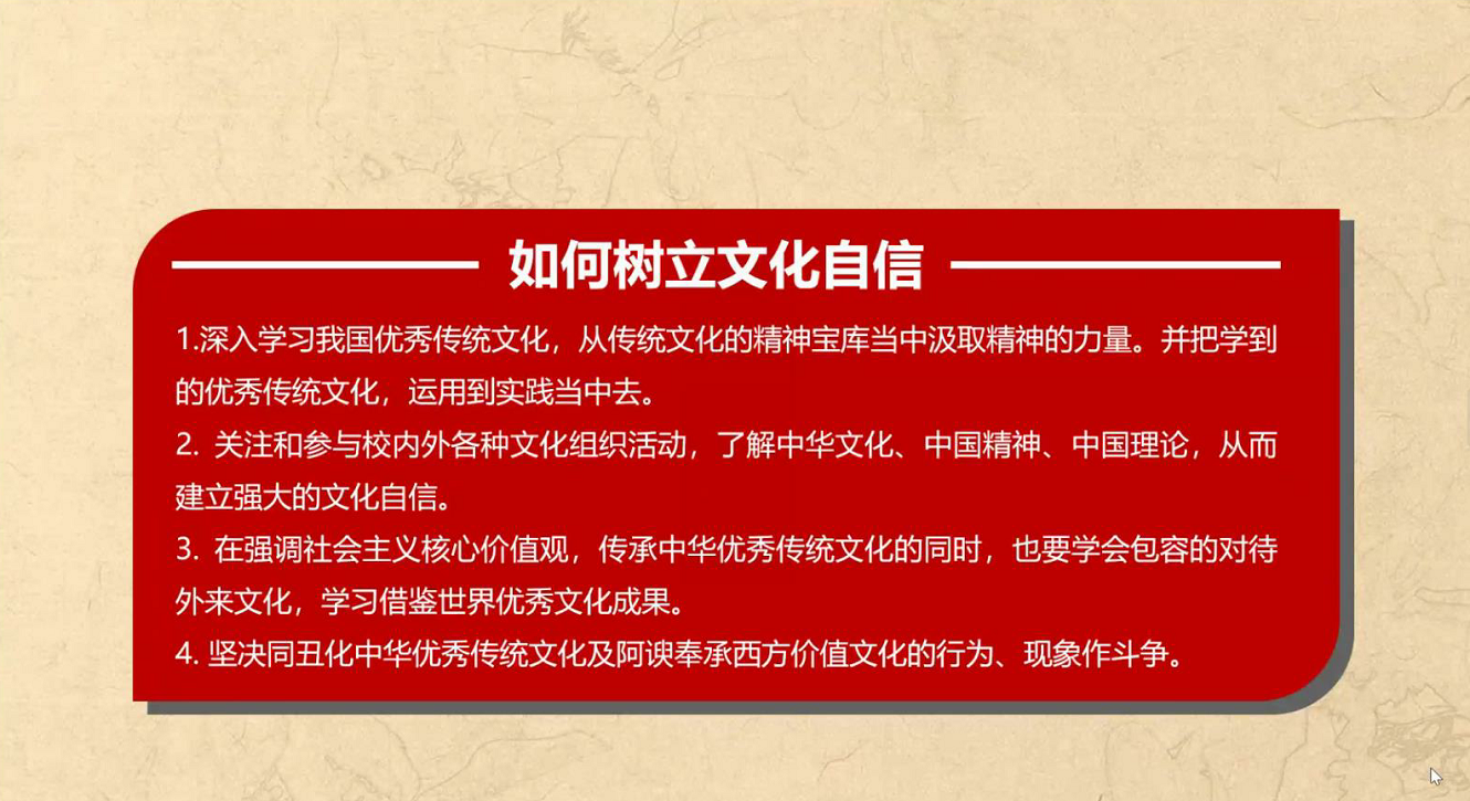 20级党小组组长庞兴会围绕“坚定中国文化自信”、“近代以来中国文化自信的历史逻辑和理论逻辑”、“中国文化自信的底气何在”和“我们该如何发扬中华优秀传统文化”四个部分展开。