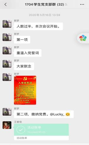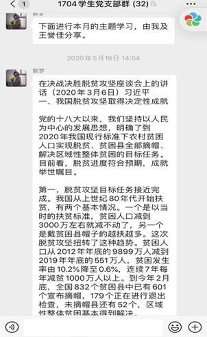 (通讯员 刘学 )2020年5月16日下午2点,法律硕士教育中心1704班党支部以线上学习的形式开展5月份支部主题党日活动。本次活动的主题是“深化全面从严治党,决战决胜脱贫攻坚”。1704班全体党员参加了本次活动,活动由党支部副书记郭梦梦同志主持。