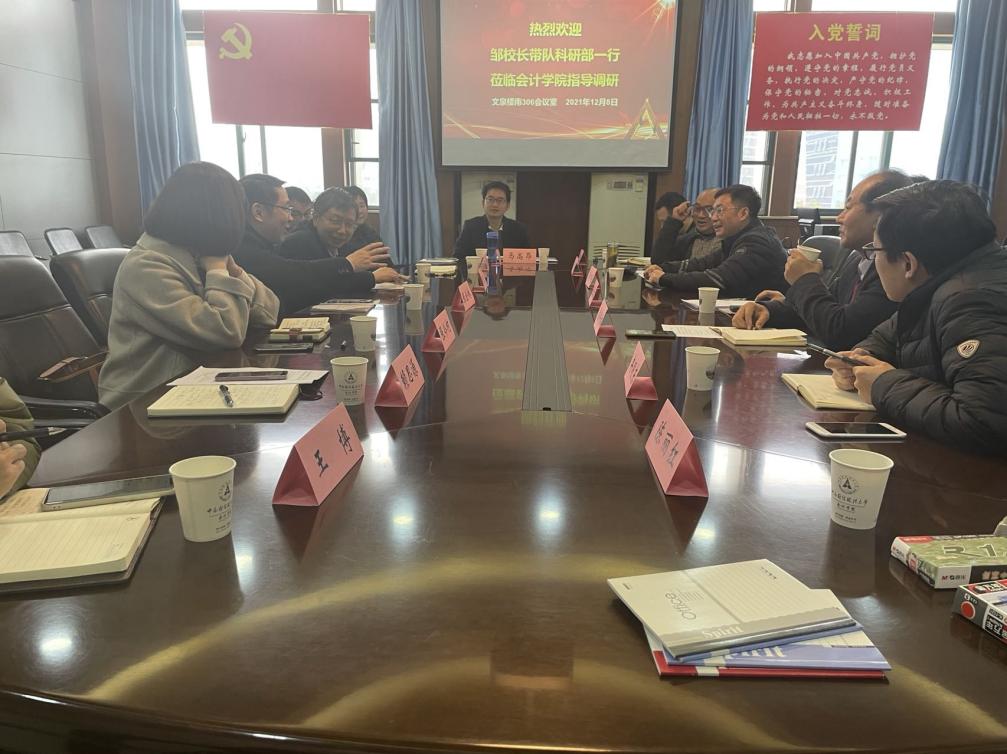12月8日上午,邹进文副校长与科研部一行莅临会计学院进行专项工作调研,分享科研部最新动态及加强与各学院之间科研方面的沟通与交流。科研部部长张金林,副部长张今柯、石智雷,六级职员赖思源、项目科科长盛辰光、成果科科员马高昂等参与调研。会计学院院领导张敦力、殷修林、冉明东、李四海、陈丽红、胡桂锬及学术委员会委员张龙平教授、李璐教授、各系主任、科研骨干等参加本次座谈会。