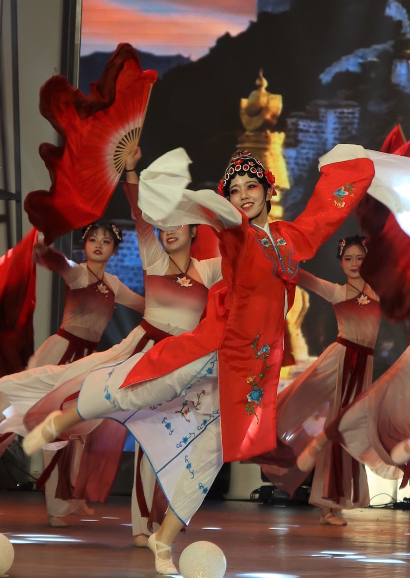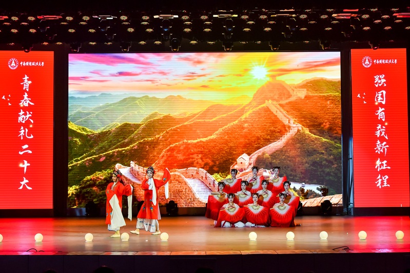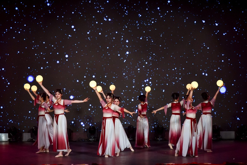 舞蹈部分结合了灯舞、绸扇舞、戏曲水袖舞等多种元素,12位硕士研究生以优美的舞姿描绘祖国山河,跳出对祖国的热爱与真情。