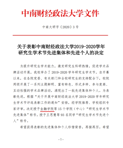 在校2019-2020学年研究生学术节表彰中,金融学院凭借主题鲜明、富有特色、形式多样、参与度高、互动性强的研究生学术活动,获评“研究生学术节先进集体”一等奖。在校2019-2020学年研究生综合表彰中,金融学院凭借扎实的工作和卓越的业绩,从众多优秀研究生会中脱颖而出,荣获“优秀研究生会”荣誉称号和“优秀研究生自办刊物”单项奖。众多金融学子荣获“研究生学术节先进个人”、“优秀研究生干部”和“优秀研究生编辑”荣誉称号。